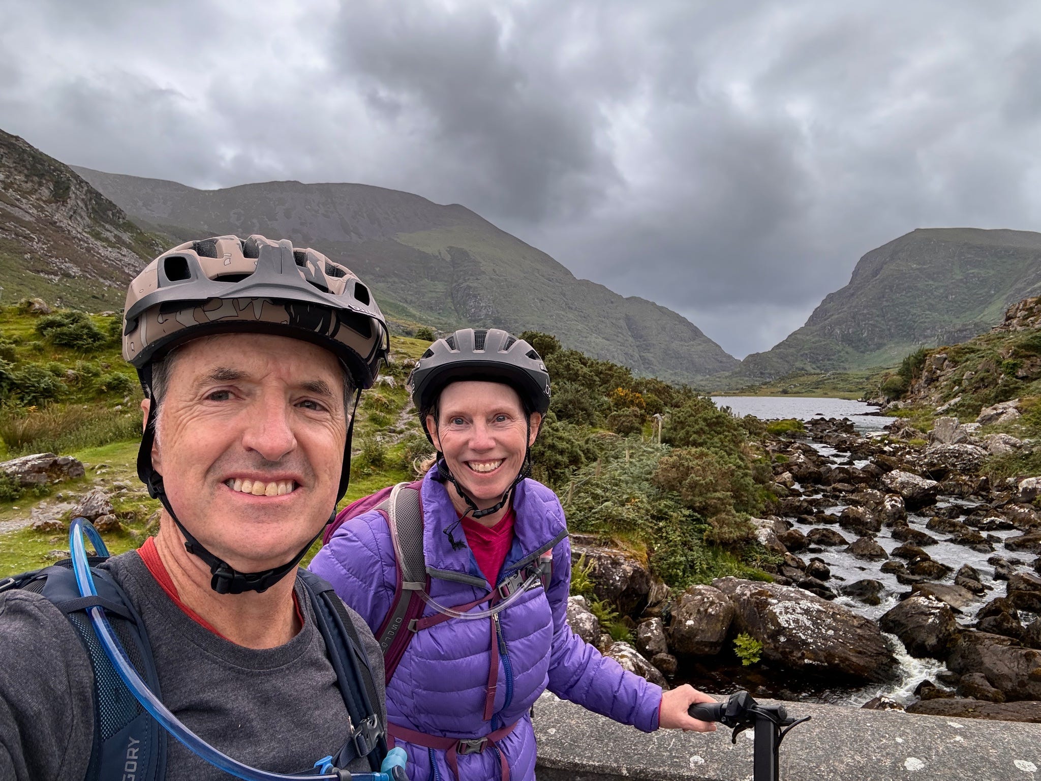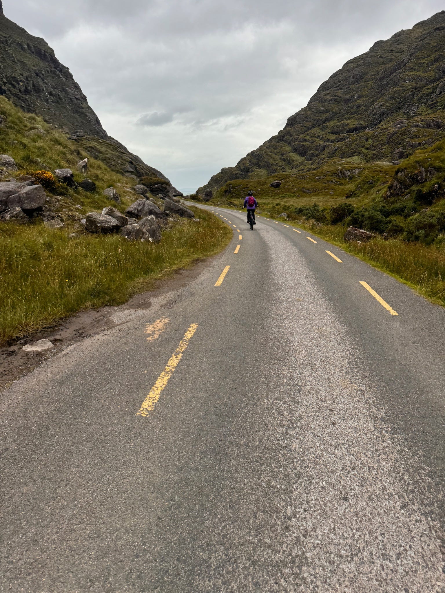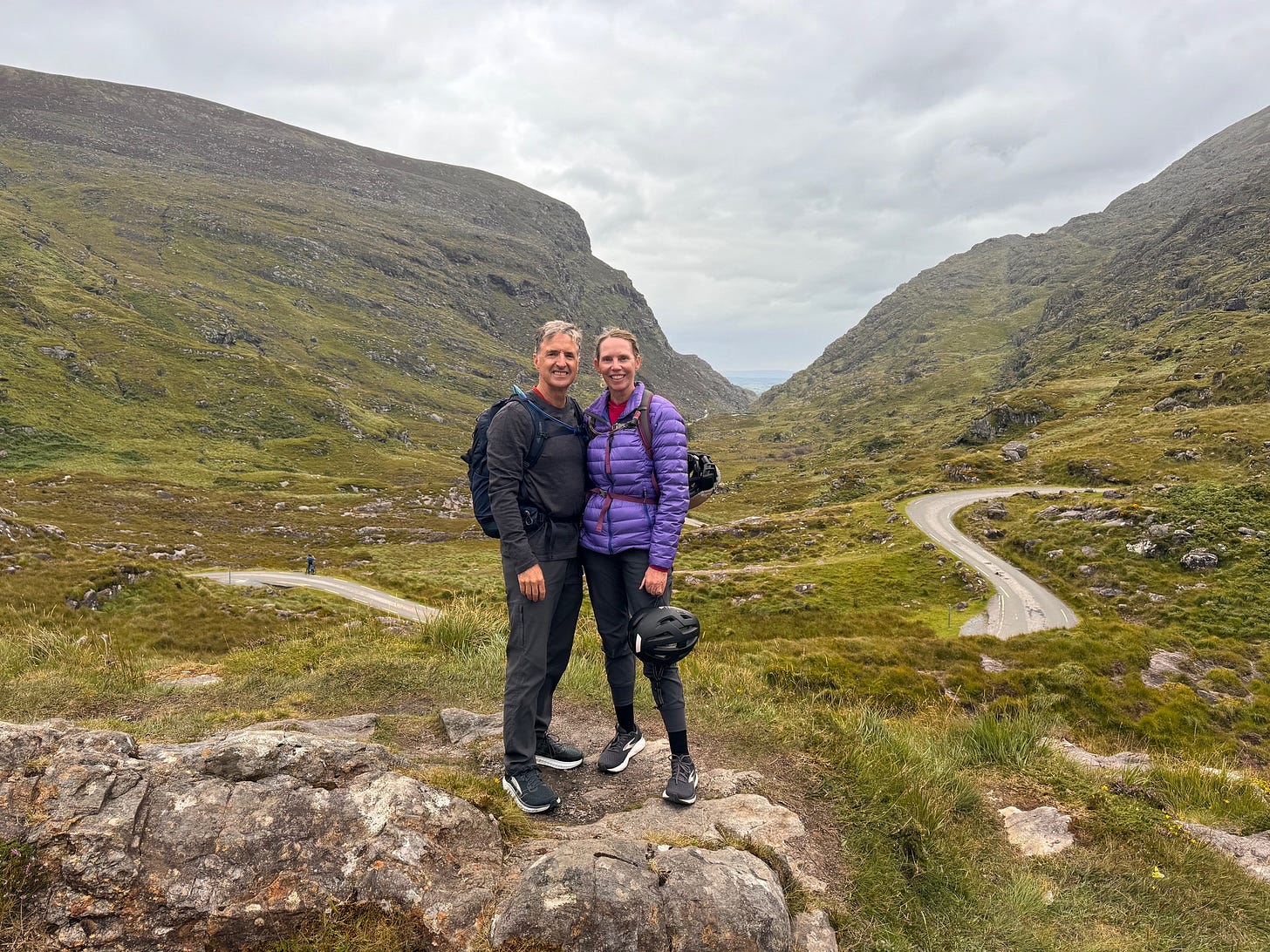 The bike ride from Lord Brandon’s Cottage back to the bike shop through the Gap of Dunloe was a 15 mile ride with about a 900 foot elevation gain in the first 7 miles hence the e-bikes! The road was narrow and curvy, shared by horse drawn jaunting cars, hikers and crazy tourists in cars. I’m surprised they didn’t have ambulances stationed along the route (no room of course)!