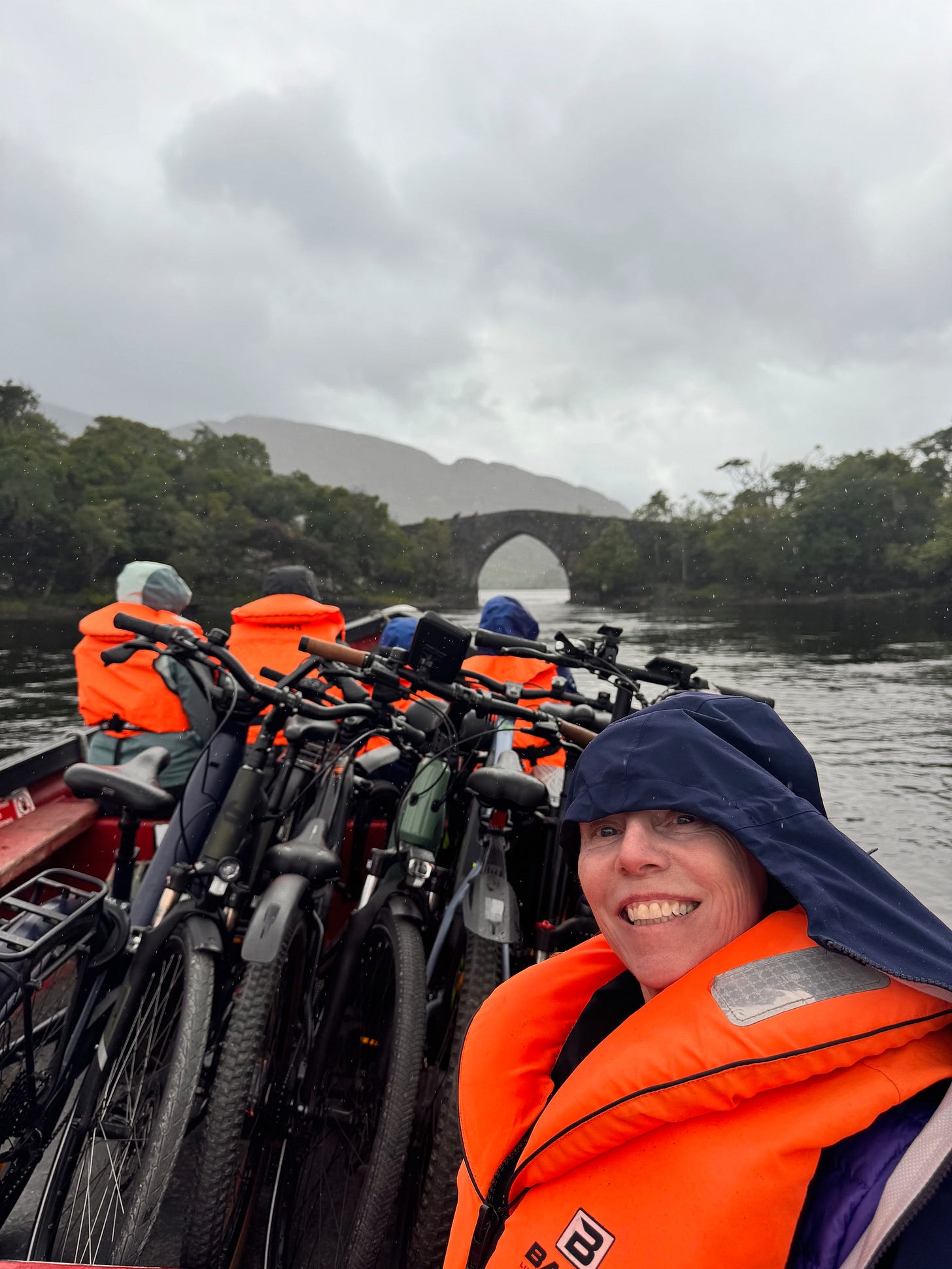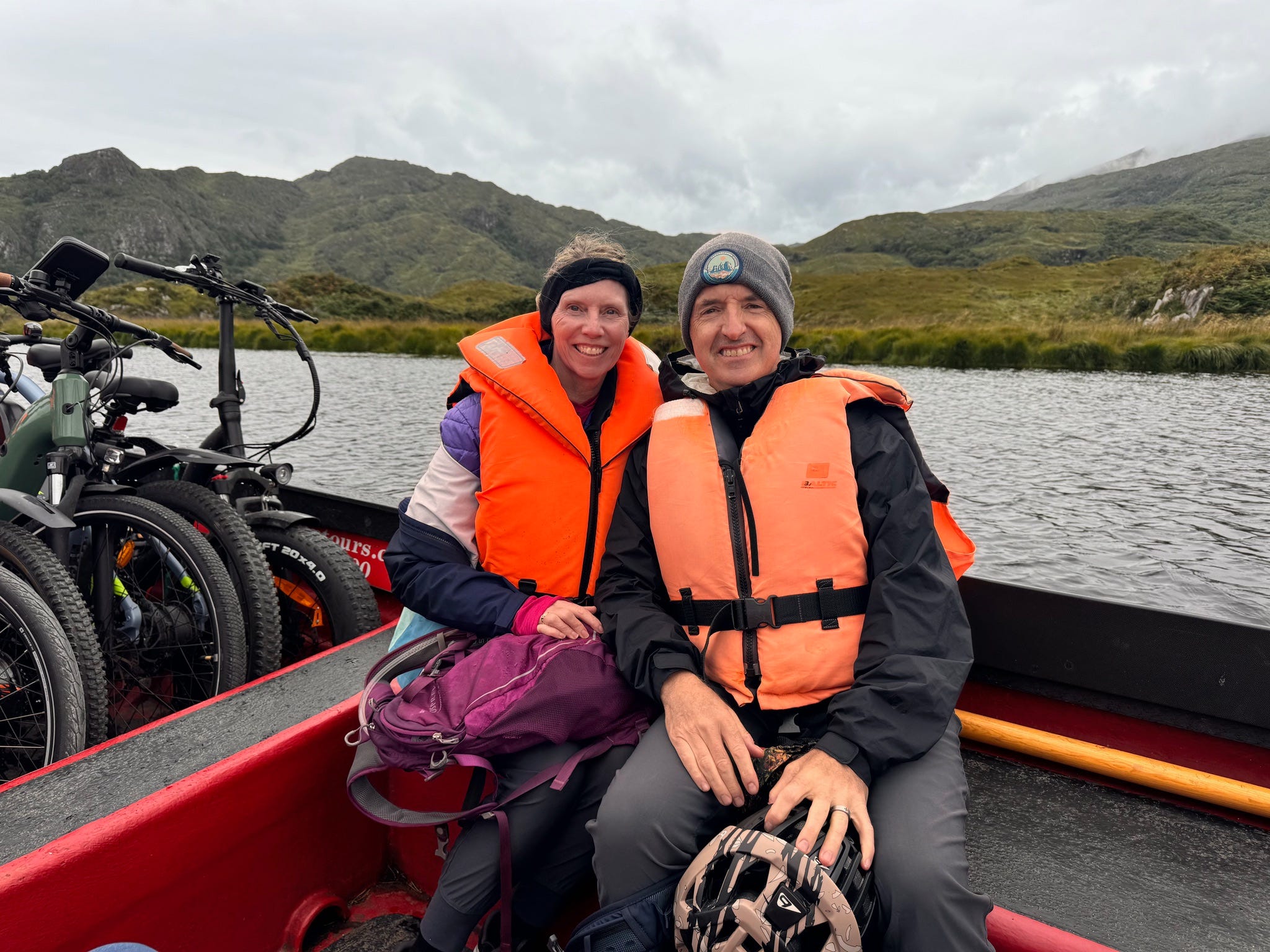 Our journey continued with a 1.5 hour boat ride through the lakes with our bikes on board (Gap of Dunloe Tours). The day was cool, cloudy and misty (ok to be honest rainy, but as my Irish Grandmother would say, it’s a gentle Irish rain!)